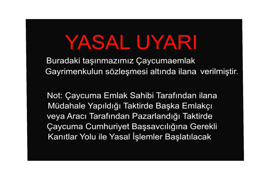 Uyarı: Bu gayrimenkul Çaycuma Emlak sözleşmesi altında satışa sunulmuştur. Çaycuma Emlak harici ilana ait detaylar, görseller, video, metal, içerikler vb. unsurların kullanılması yasaktır. Çaycuma Emlak'ın portföyünde olan gayrimenkul üzerinde izinsiz işlem yapmaya çalışan emlak, emlakçı veya vergi mükellefi olmayan şahısların gayrimenkulü satmaya, pazarlamaya, mal sahibine ulaşmaya çabalaması yasaktır. Tespit edilmesi durumunda aracı olan dahil satılan gayrimenkul sahibi ve alıcı hakkında hukuki işlem başlatılacaktır.